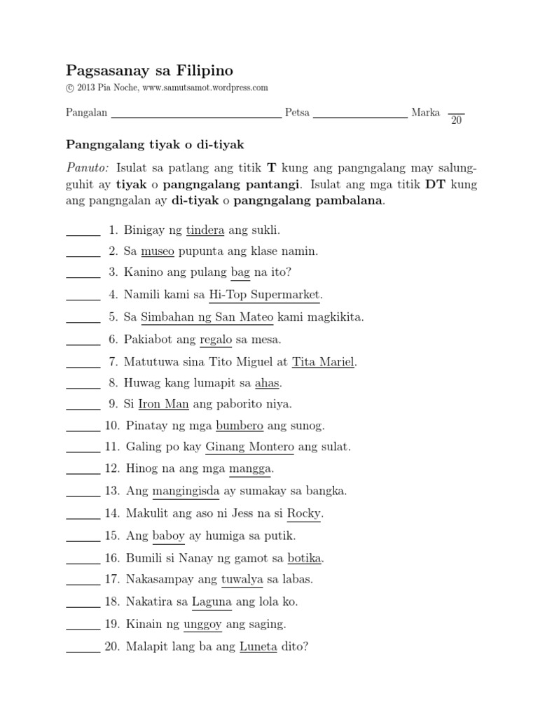Kaganapang pansimuno subject complement pamuno appositive tuwirang layon direct object of the verb layon ng pang-ukol object of the preposition panawag noun in the vocative case You may print and distribute these worksheets to your children or students but you may not distribute these for profit. Lagyan ng ang tamang kasarian ng salitang aso. This 40-item spreadsheet has two parts.
